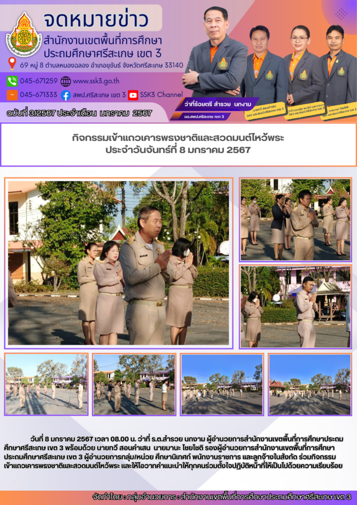 กิจกรรมเข้าแถวเคารพธงชาติและสวดมนต์ไหว้พระ ประจำวันจันทร์ที่ 8 มกราคม 2567 15/03/2024 Last updated : 15/03/2024 admin