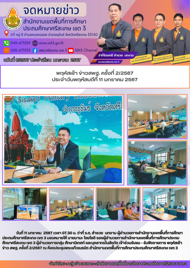 พฤหัสเช้า ข่าวสพฐ. ครั้งที่ 2/2567 ประจำวันพฤหัสบดีที่ 11 มกราคม 2567 15/03/2024 Last updated : 15/03/2024 admin