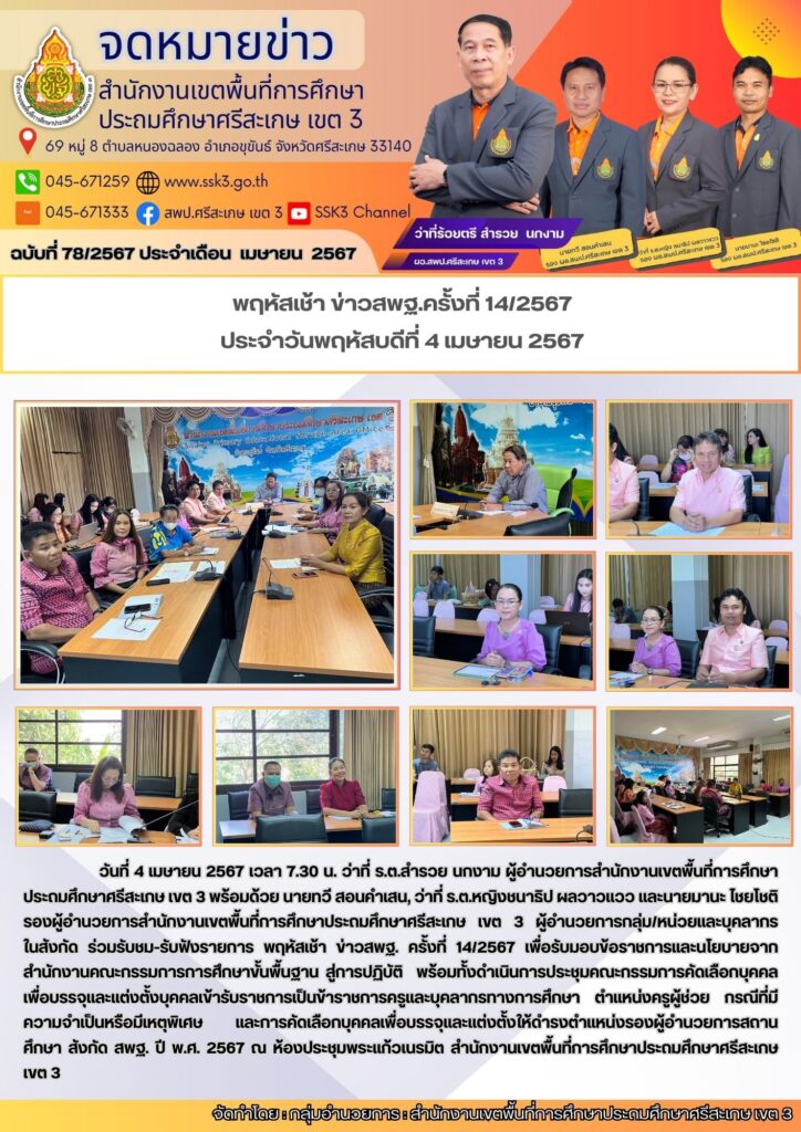พฤหัสเช้า ข่าวสพฐ.ครั้งที่ 14/2567 ประจำวันพฤหัสบดีที่ 4 เมษายน 2567 25/06/2024 Last updated : 25/06/2024 admin