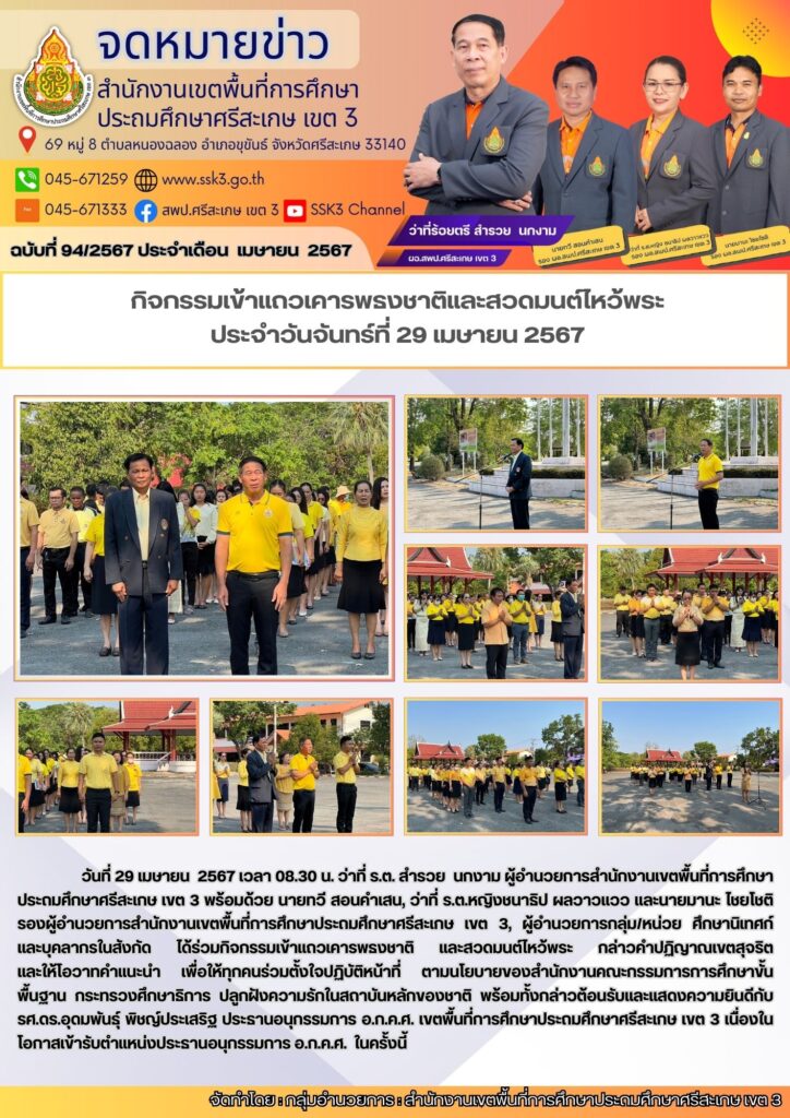 กิจกรรมเข้าแถวเคารพธงชาติและสวดมนต์ไหว้พระ ประจำวันจันทร์ที่ 29 เมษายน 2567 25/06/2024 Last updated : 25/06/2024 admin