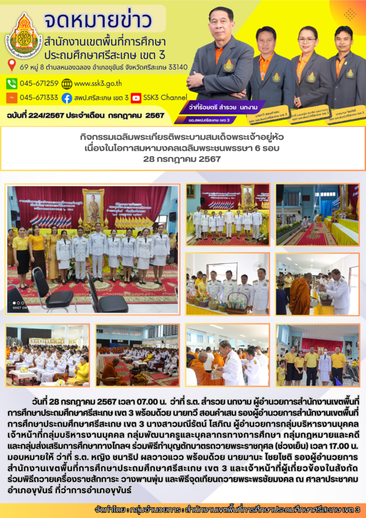 กิจกรรมเฉลิมพระเกียรติพระบามสมเด็จพระเจ้าอยู่หัว เนื่องในโอกาสมหามงคลเฉลิมพระชนพรรษา 6 รอบ 28 กรกฎาคม 2567 01/08/2024 Last updated : 01/08/2024 admin